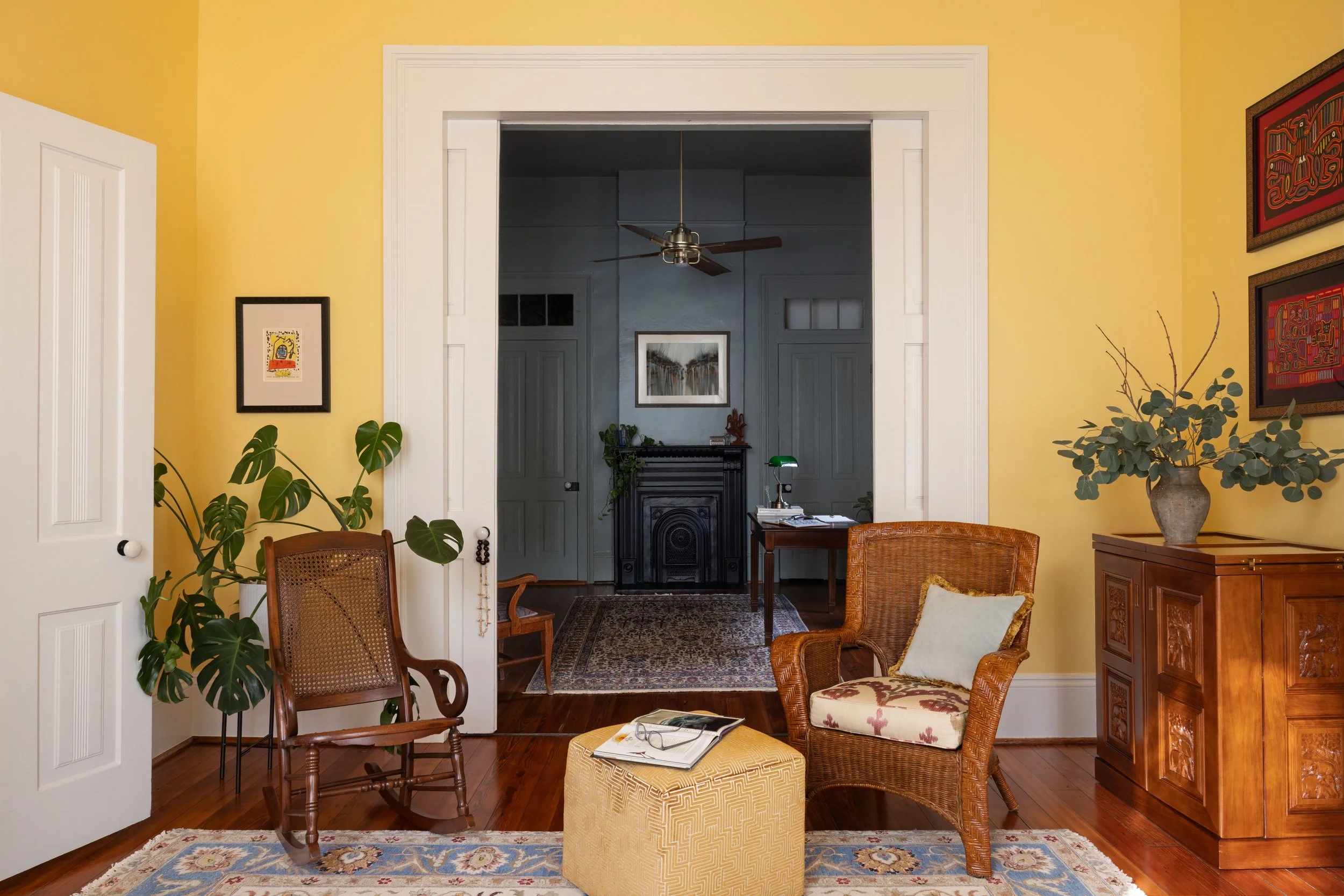 This historic Bywater side hall home was thoughtfully transformed by removing a rear addition and rebuilding it to match the original 12-foot ceilings, creating a more expansive kitchen and living area. A full wall of windows now fills the deep blue kitchen with natural light, while the former bathrooms were reimagined as a spacious primary suite and a moody secondary bath. The historic front rooms and sidehall were preserved, with original transoms and casings carefully reused.